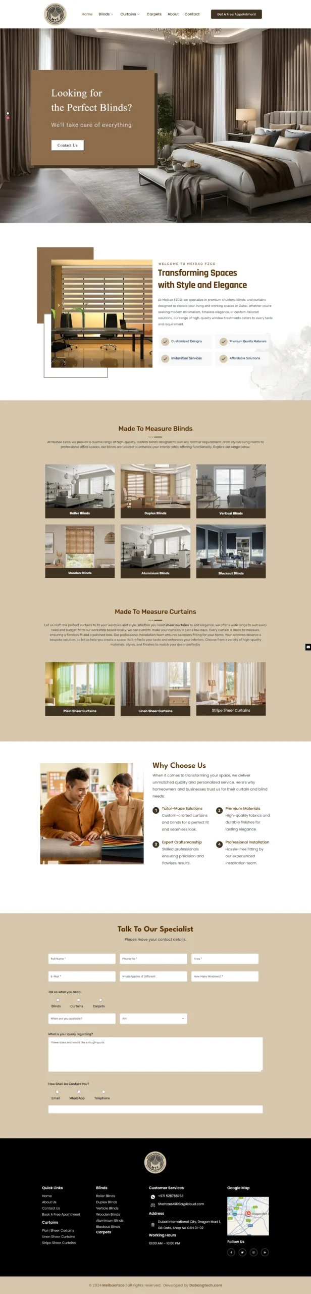 Meibao FZCO is a Dubai-based specialist in premium curtains, blinds, and shutters. Dabang Tech collaborated to craft a sleek, mobile-optimized website that showcases Meibao’s craftsmanship and enhances customer experience.